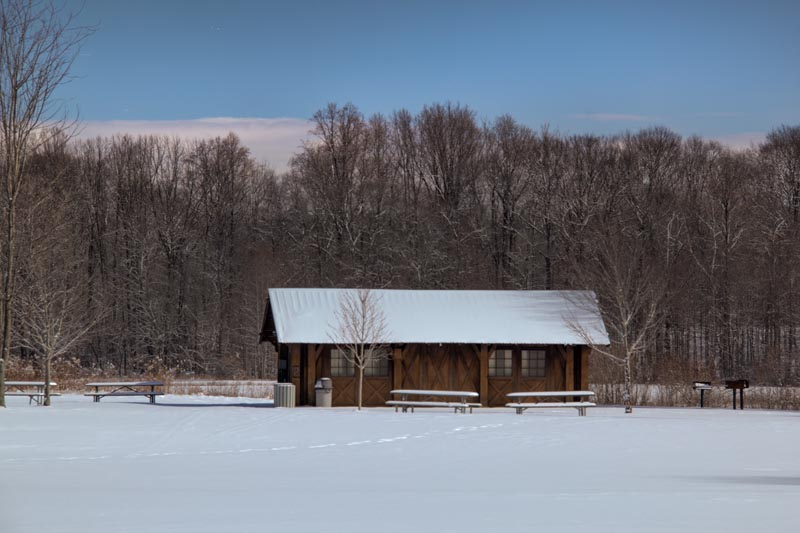 There is a restroom, and picnic shelters. It mentions a sledding hill on the map but not really very good except for tiny children. If you west about two miles on Parsons Road which is just south of the park there is much better hill in New Russia Township which I have photo posted on the site.